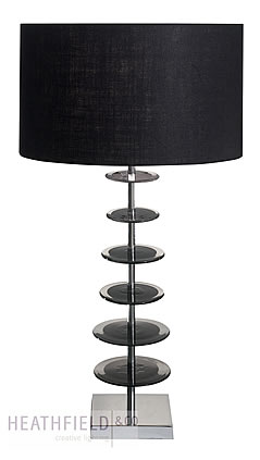 Original lamp design created from hand moulded discs of crystal glass. Height shown below with and without shade. **shade not included in price**