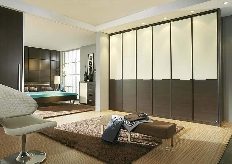 Stylish sliding and folding-door wardrobes with wooden finish doors with glass insert panles in a wide range of sizes. Wardrobe comes with 1 hanging rail and 2 shelves per section. A range of accessories is available.