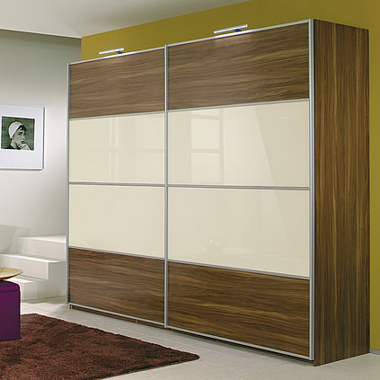 Stylish sliding door wardrobes with wooden and glass finish doors in a wide range of sizes. Wardrobe comes with 1 hanging rail and 2 shelves per section. A range of accessories is available.
